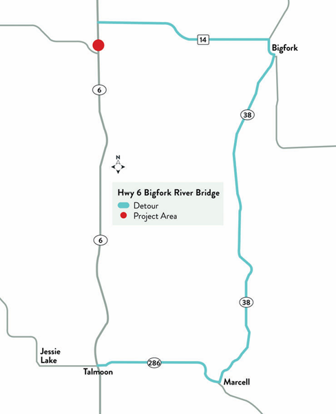 Bridge No. 31036 over the Big Fork River (where County State Aid Highway (CSAH) 14 joins Highway 6) will be completely replaced with a detour running from June to November, according to Margie Nelson of the Minnesota Department of Transportation. The detour shown on the map at right for northbound travelers begins at Talmoon and travels on TH 286 through Marcell and Bigfork before returning to Highway 6 along CSAH 14.